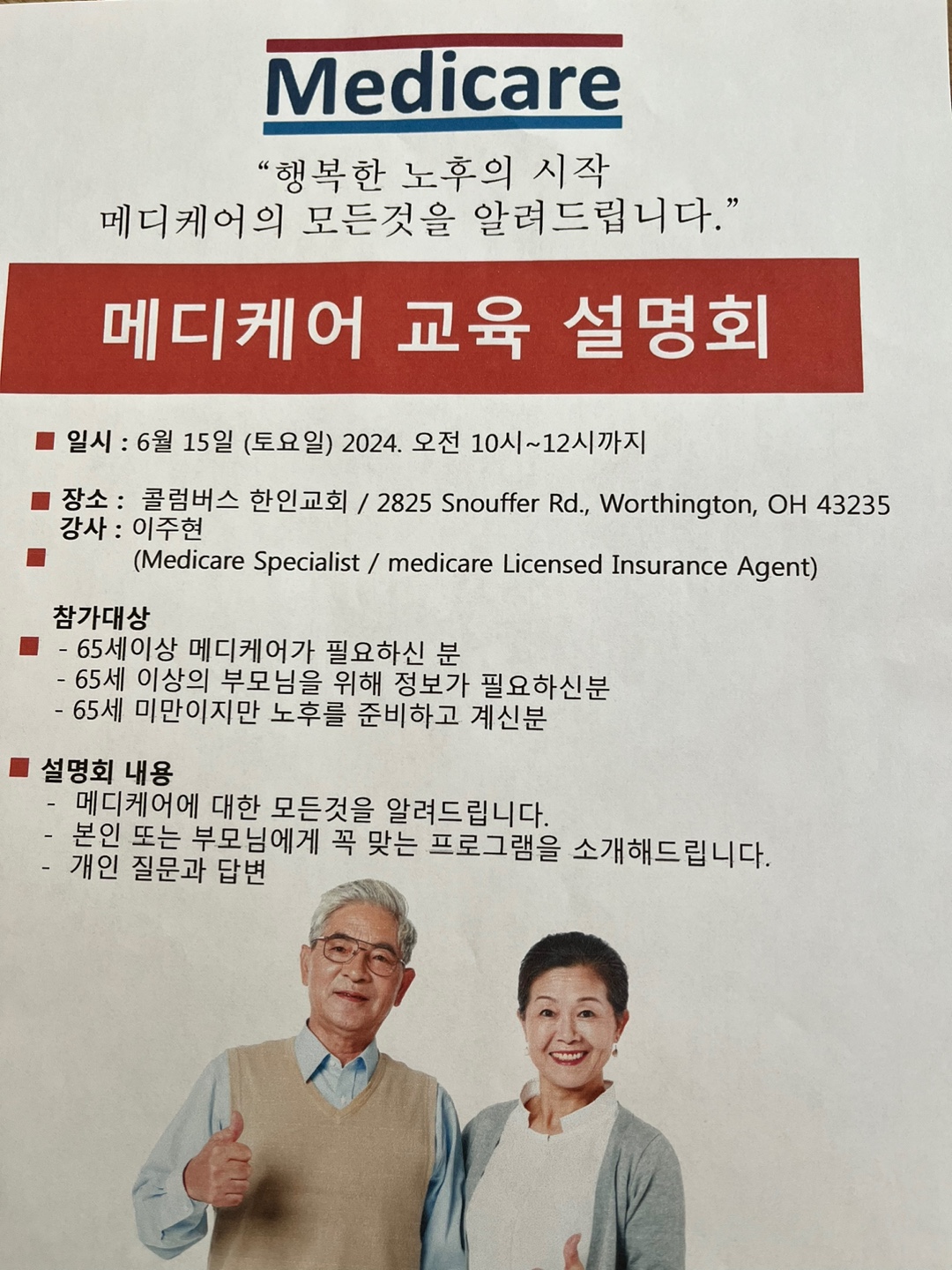 ▫ 여전도회 주관으로 메디케어 설명회가 6/16 (토) 10시에